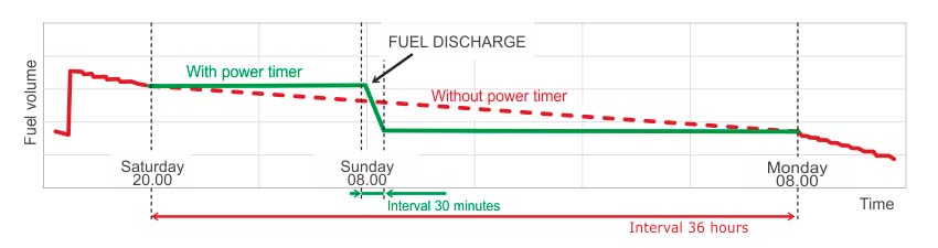 Power timer PT-01 provides both – when vehicle is off, device will switch on power supply to telematics devices for a short period of time, so that all devices could send their data to tracking device, which would, in turn send it back to the server, providing continuous supervision over the vehicle and additional equipment, like fuel level sensors, axle load and any other valuable sensors on board.